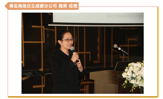 最后,本次會(huì)議支持企業(yè)青島海信日立空調(diào)營(yíng)銷(xiāo)股份有限公司成都分公司技術(shù)部魏萊經(jīng)理上臺(tái)發(fā)言,并作全品類海信中央空調(diào)應(yīng)用分享。